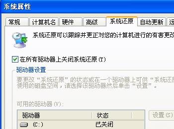 关闭”系统还原” 方法:打开[控制面板]→[系统]→[系统还原],把”在所有驱动器上关闭系统还原’勾上 说明:系统还原是便于用户误操作或产生软件问题时的一种挽救手段,可以回复到误操作以前的状态.不建议初级用户使用.当然,它采用的是跟踪手段,需要记录大量信息,所消耗的资源也要很大的. 立即节省:数百M (根据还原点的多少而不同) 您也可以在不关闭系统还原的前提下,相应的减少系统还原所占的磁盘空间,这只会减少可用还原点的数目,一般还原点有一两个就够了吧. 方法:…[系统还原]-选择一个”可用驱动器”-[设置]-调整”要使用的磁盘空间”