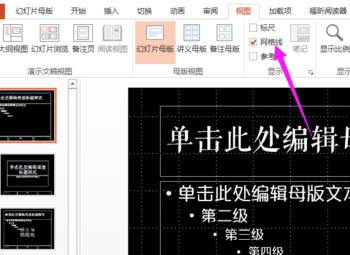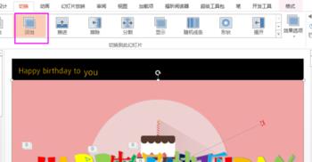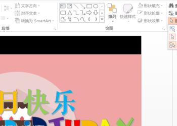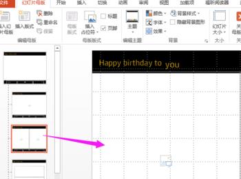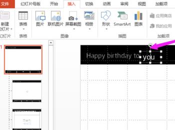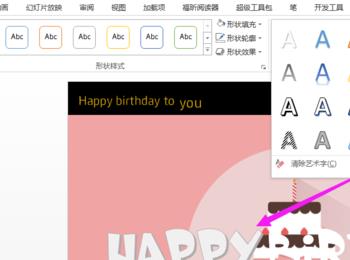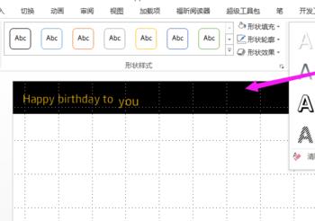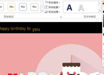 插入2个文本框,分别输入Happy birthday to(18点)和you(20点),两个文本框错落放置。进入绘图工具,选择金色的艺术字样式。 退出母板视图,勾掉网格线。
