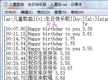 找到歌曲的lrc文件,改成txt文件,打开可以看到时间线。小编已经把每句需要的时间都算好了……如果会乐理的话时间可以掌握得更准确。从中可以知道,片头7秒,片尾11秒。差不多3.55秒换一张幻灯片。