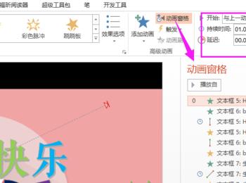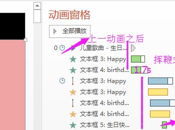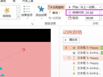Happy birthday使用空翻的动画效果,设置从上一项开始,打开效果选项,设置动画文本的发送方式,另外计时设置动画时间快慢。