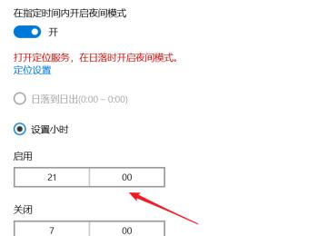 4. 第四步按照需求选择【日落到日出、设置小时】。根据下图箭头所指,小编以【设置小时】为例,分别设置启用、关闭时间。