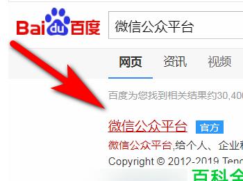 2.第二步,来到下图所示的搜索结果页面后,点击箭头所指的微信公众平台官网。