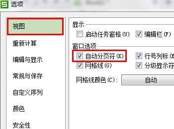 ②通过【选项】按钮打开【选项】窗口后,在左侧的菜单中选择【视图】,然后去掉【自动分页符】的勾选,点击【确定】
