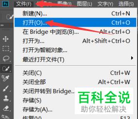 1. 首先第一步打开电脑中的PS软件,根据下图箭头所指,依次点击【文件-打开】选项。