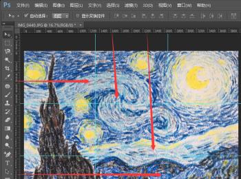 1. 第一步,打开电脑中的ps软件,然后将需要处理的图片导入其中,然后利用快捷键ctrl+r来将标尺打开,再点击标尺,并拖动来创建一个参考线,并将图片分成九宫格。