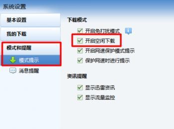 在打开的窗口中切换至“模式与提醒”选项卡,然后勾选“开启空闲下载”项即可。
