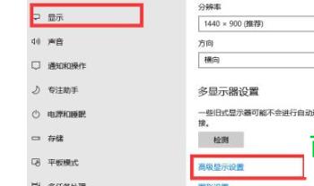 2. 在打开的显示设置页面,点击左侧的显示选项,然后在右侧打开的页面,找到高级显示设置选项,点击。
