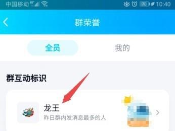 5. 然后在群互动标识栏中即可看到龙王图标了。只有群内发消息最多的人才能获得龙王图标;