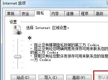 在”隐私”选项卡中的级别设为”默认”,只要点击“默认值”选项变灰即可