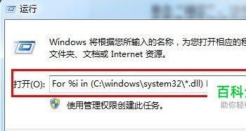 弹出“运行”窗口,然后输入以下For命令: For %i in (C:\windows\system32\*.dll) Do regsvr32.exe /s %i 单击“确定”按钮,即可逐一注册System32目录下的所有动态链接库文件