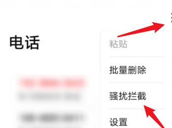 1.第一步,点击并打开拨号图标,接着点击右上角竖着的三个点的图标,然后点击箭头所指的骚扰拦截选项。