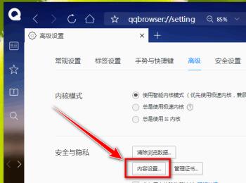 3. 第三步进入【高级】页面后,根据下图箭头所指,点击【内容设置】选项。