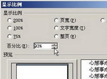 第2步,在打开的“显示比例”对话框中,用户既可以通过选择预置的显示比例(如75%、页宽)设置Word2007页面显示比例,也可以微调百分比数值调整页面显示比例,如图2所示。