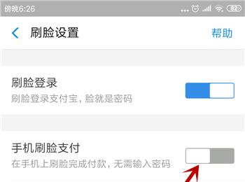 5. 第五步,跳转至刷脸设置页面,点击下方手机刷脸支付功能右侧的开关。