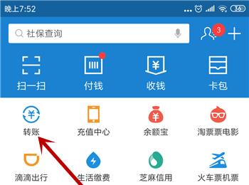 1. 第一步,打开手机中的支付宝软件,在首页中点击下方的转账图标。