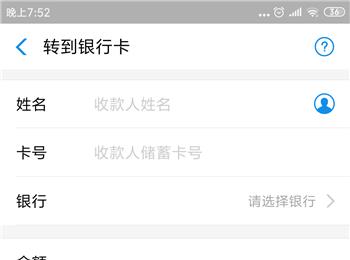 3. 第三步,来到转到银行卡页面,输入对方的银行卡信息,包括姓名、卡号、银行与金额。