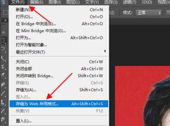 2.第二步,来到下图所示的PS软件主页面后,点击页面顶部的文件选项,接着点击弹出窗口中的存储为web所用格式选项。