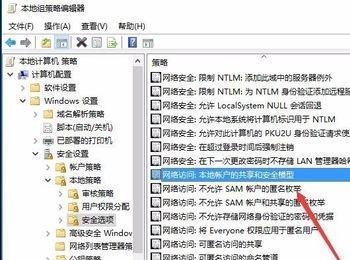 5、这时在右侧窗口中找到“网络访问:本地帐户的共享和安全模型”一项;
