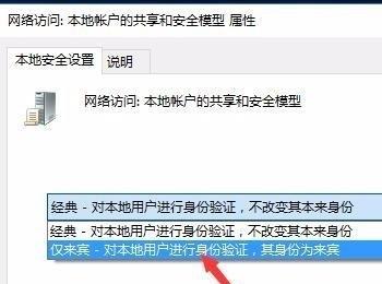6、双击该项后打开其属性窗口,在这里点击下拉菜单,选择“仅来宾,对本地用户进行身份验证,其身份为来宾”菜单项;