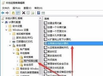 9、接着再依次点击“计算机配置/Windows设置/安全设置/本地策略/用户权限分配”折叠菜单,在右侧窗口中找到“从网络访问此计算机”策略;