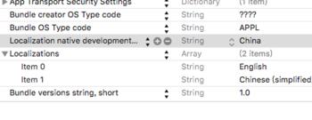打开info, 找到“Localization native development region”,如下图。