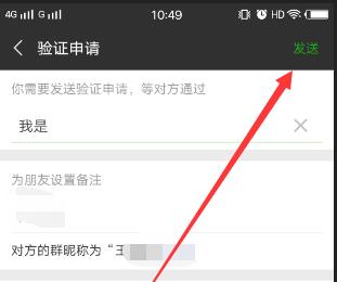 若对方设置了好友验证,则需要填写验证申请,确认后点击右上角的发送。