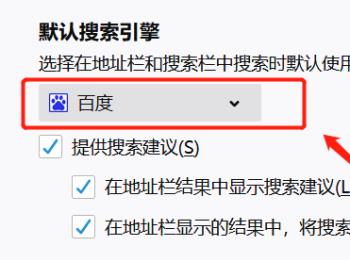 4. 第四步在右侧页面中,根据下图箭头所指,点击【默认搜索引擎】下的【百度】选项。