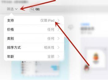 1.第一步,点击并打开应用商店,接着搜索qq软件,然后点击筛选右边你的下拉箭头,并点击弹出窗口中的支持选项。