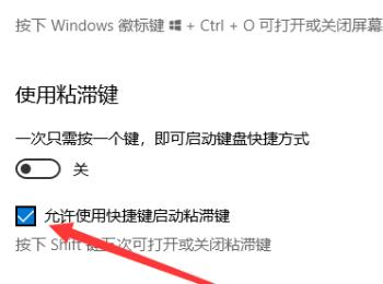 6. 第六步在右侧页面中,根据下图箭头所指,找到【允许使用快捷键启动沾滞键】选项。