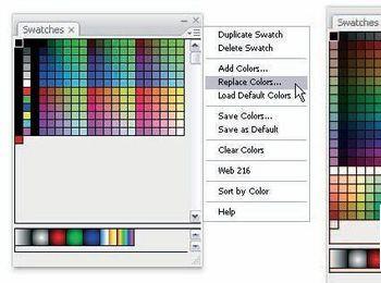 有时并不需要省缺的调色板,只需在工作中使用一个简单的方法。删除或替换当前的颜色样本是一个好主意。你可以重新混合或添加一个新的颜色或导入现有的颜色设置,颜色表或者甚至一个GIF文件。从下拉菜单中选择替换颜色并导航到包含你想使用颜色的 *.clr, *.act or *.gif 文件。这里我导入了一个由Warren Fuller的NTSC的安全颜色面板。