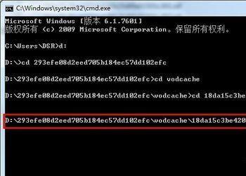 打开cmd,本经验操作是根据如图演示的地址进行的,先输入 D: 然后按下回车,再输入 cd293efe08d2eed705b184ec57dd102efc (注意中间有空格) 然后再次按下回车,到这一步相当于我们进入到了293efe08d2eed705b184ec57dd102efc文件夹中,然后再输入cdvodcache 按下回车,直到进入到有.tdl的文件夹,下面看图示错作。