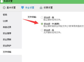 最后,在我们进入到QQ的系统设置面板后,我们点击面板中的“安全设置”,然后从该选项下找到“文件传输”这一选项,点击√选“安全级-中(推荐”这一选项。