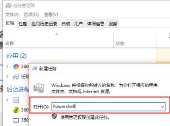 2. 第二步打开【新建任务】窗口后,根据下图所示,在命令行中输入【Powershell】并点击【确定】选项。
