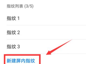4. 如图,在指纹列表,可以看到我们总共可以添加五个指纹,已经添加了3个了,点击下方的新建屏内指纹。