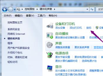 4. 进入硬件和声音页面后,选择设备和打印机下的鼠标选项,点击。