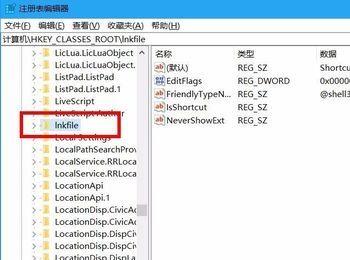 找到HKEY_CLASSES_ROOT\lnkfile,选择linkfile后右边会出现数值。