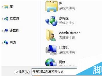 3、点击菜单栏上的文件—另存为,在保存窗口中将保存类型修改为“所有文件”,将文件名修改为“修复网站无法打开.bat”(“.bat”一定不能少)然后点击保存;