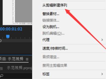 4. 第四步鼠标右键单击视频素材,在弹出的菜单栏中根据下图箭头所指,点击【从剪辑新建序列】选项。