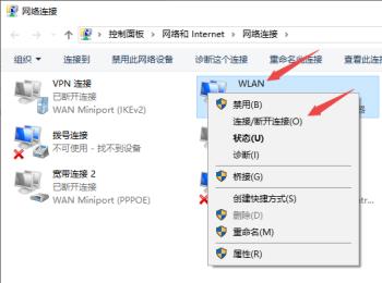 5. 第五步打开【网络连接】窗口后,鼠标右键单击【WLAN】图标,在弹出的菜单栏中根据下图箭头所指,点击【连接/断开连接】选项。