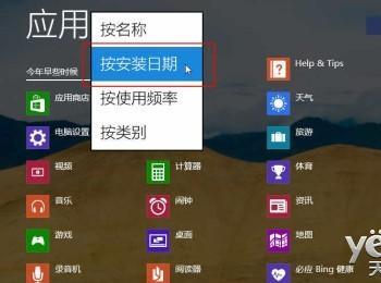 注意,在“应用”二字的右边有一个排序分类的选项,点击下图中红框所示的小箭头,在下拉菜单中选择分类方式为“按安装日期”。瞬间所有Win8.1系统内安装的所有应用会重新排序,而最新安装的应用自然会排列在第一位,而且新安装的应用图标右侧还会额外显示“新增”字样。找到新安装的应用之后,大家可以按鼠标右键或者在触摸屏上长按该应用图标打开界面下方的命令栏,点击“固定到开始屏幕”,即可将所选应用固定到开始屏幕方便选用。