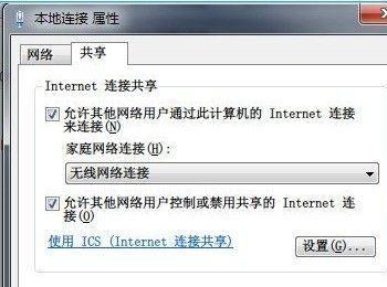b、右键单击已连接到Internet的网络连接,选择“属性”,切换到“共享”选项卡,选中其中的复选框,并选择允许其共享Internet的网络连接在这里即我们的虚拟Wifi网卡: