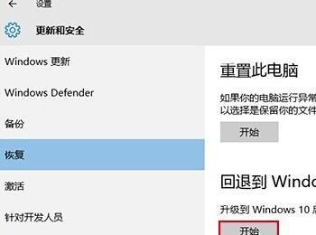 1、打开设置→更新和安全→恢复,找到“回退到Windows7(或Windows 8.1)”,点击“开始”;