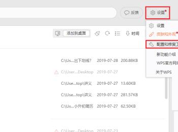 1. 第一步,双击或者右击打开WPS软件,接着点击齿轮样的设置选项,然后点击弹出选项框汇总的配置和修复工具。