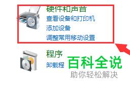4.在下图所示的控制面板页面中,点击箭头所指的硬件和声音选项。