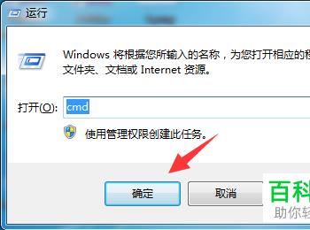 1. 首先第一步按下【Win+R】快捷键打开【运行】窗口,根据下图箭头所指,在方框中输入【cmd】并点击【确定】选项。