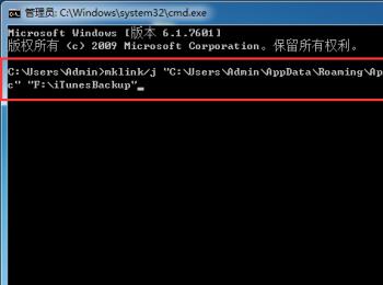 2. 第二步打开【cmd.exe】窗口后,根据下图所示,在命令行中输入【mklink/j "C:\Users\Admin\AppData\Roaming\Apple Computer\MobileSync""F:\iTunesBackup"】并按下【回车】键。