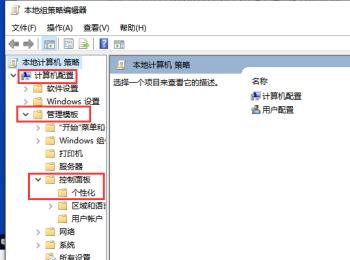 2. 如图,在打开的本地组策略编辑器页面,依次点击左侧的“计算机配置/管理模板/控制面板/个性化”选项。