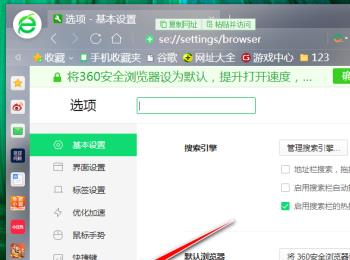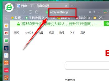 1. 首先打开电脑上的360安全浏览器,进入主页面后,在上方的地址栏输入“ se://settings ”,回车。