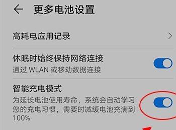 4. 第四步打开【更多电池设置】窗口后,根据下图箭头所指,将【智能充电模式】选项后的圆圈向右滑动,启用该功能。