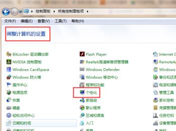 在【调整计算机的设置】下方选择【个性化】(在查看方式为小图标的状态下)。如下图所示: